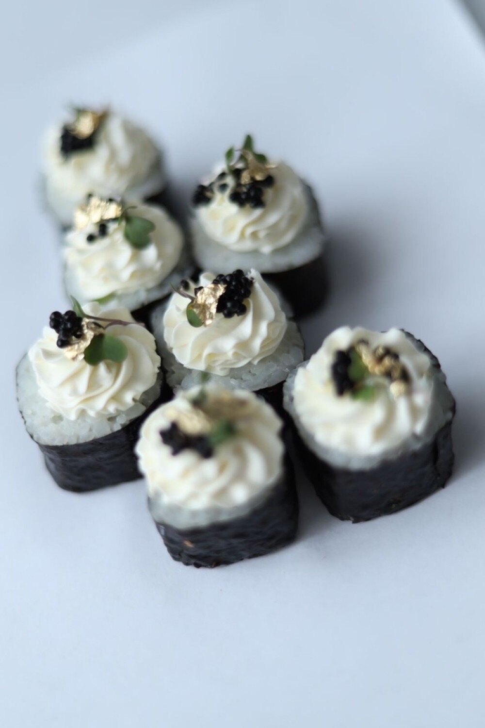 Маки с лососем, огурцом и масага, украшенный золотой пищевой поталью.